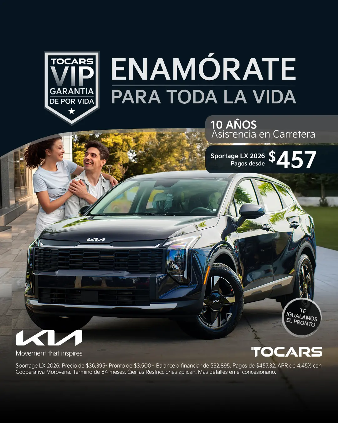 Sportage LX 2026: Precio de $36,395- Pronto de $3,500= Balance a financiar de $32,895. Pagos de $457.32. APR de 4.45% con Cooperativa Moroveña. Término de 84 meses. Ciertas Restricciones aplican. Más detalles en el concesionario.