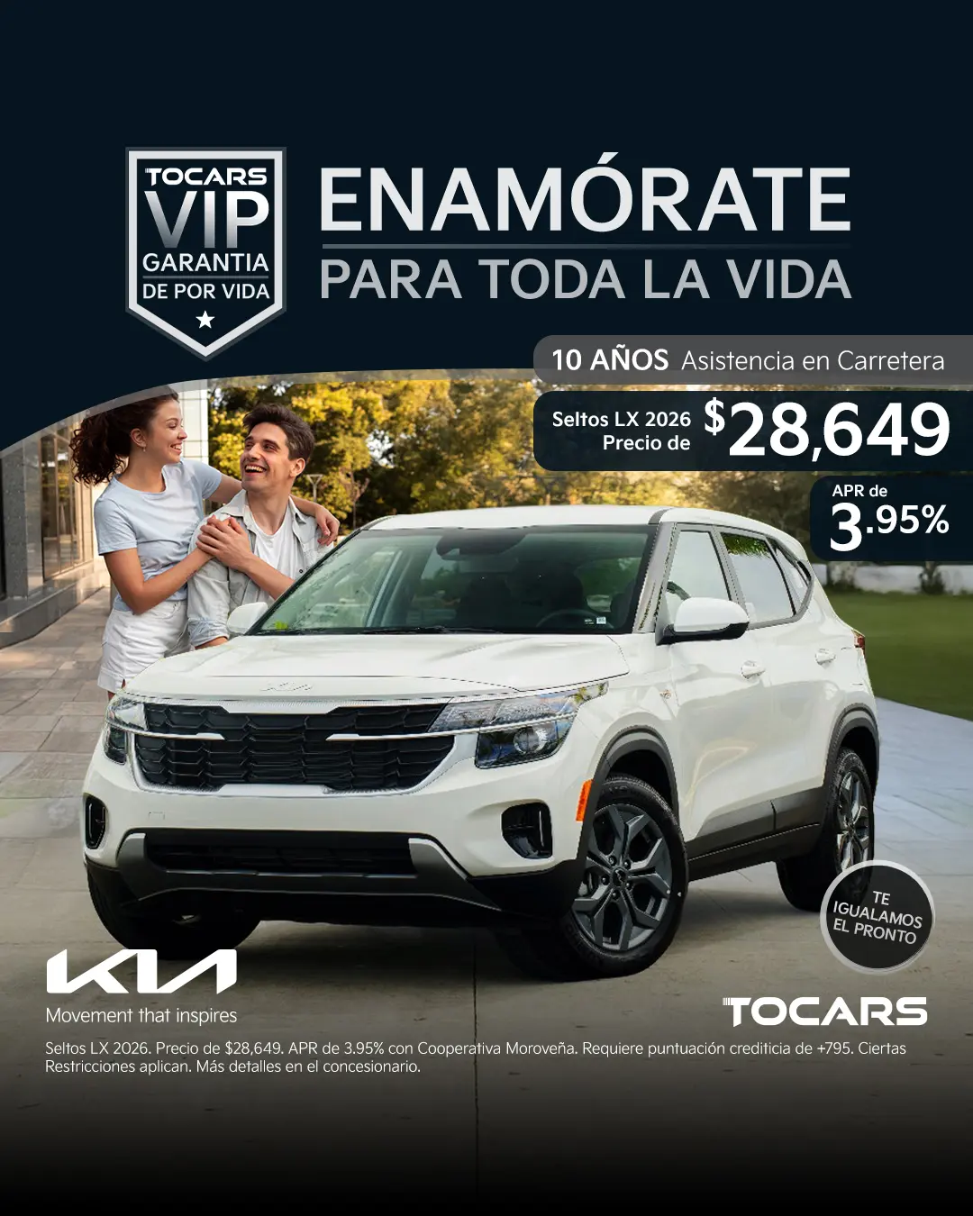 Seltos LX 2026. Precio de $28,649. APR de 3.95% con Cooperativa Moroveña. Requiere puntuación crediticia de +795. Ciertas Restricciones aplican. Más detalles en el concesionario.