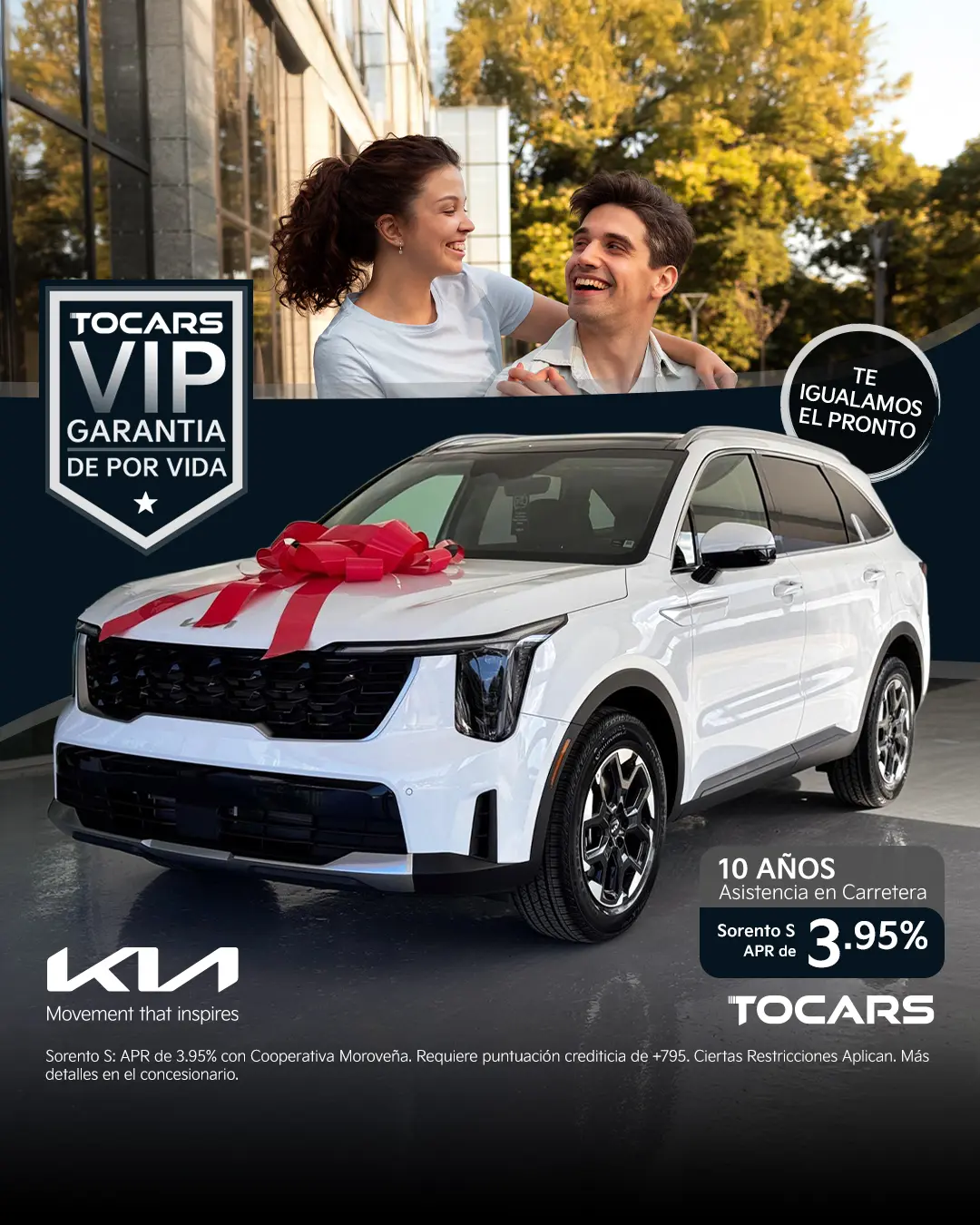 Sorento S: APR de 3.95% con Cooperativa Moroveña. Requiere puntuación crediticia de +795. Ciertas Restricciones Aplican. Más detalles en el concesionario.